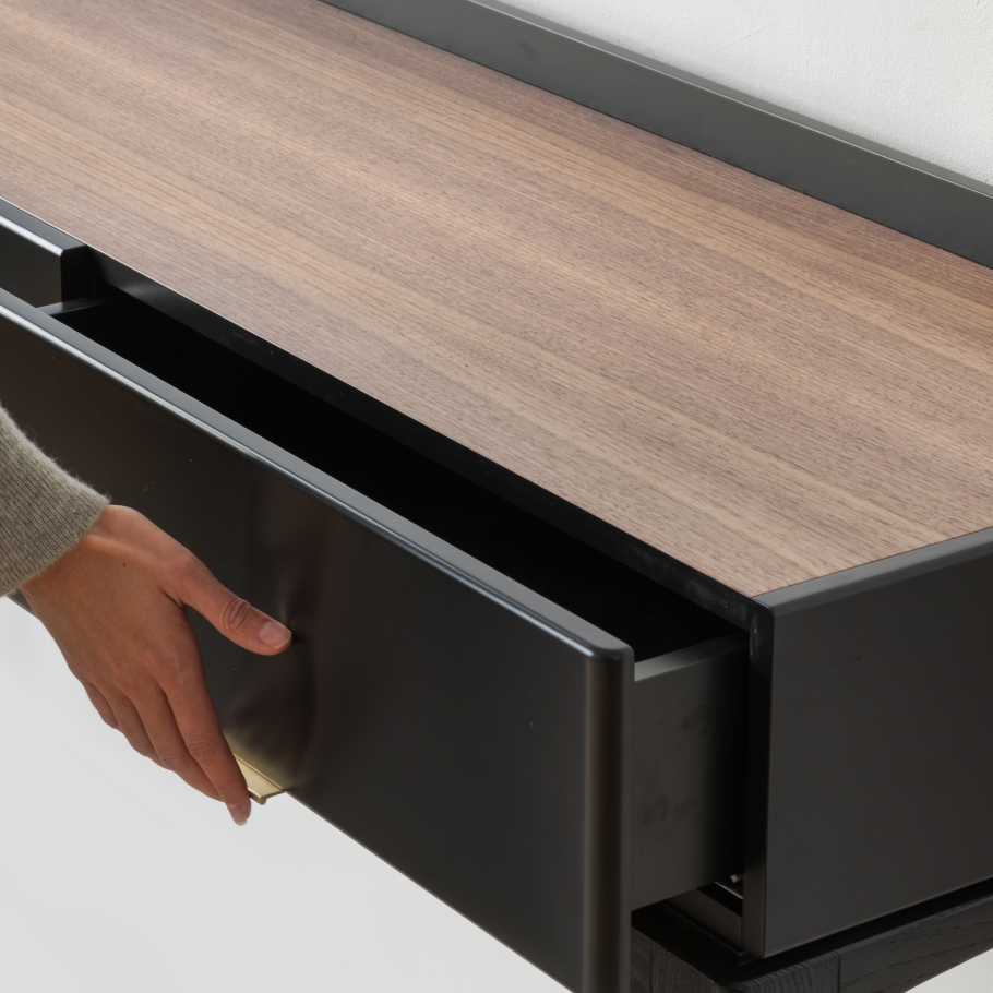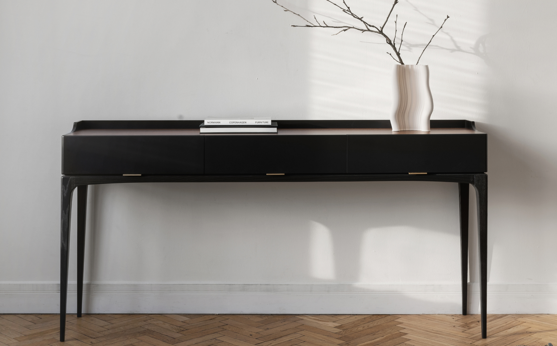 Изящные опоры консоль Tynd создают ей легкий образ, который дополнит любое пространство, не перегружая его. В зависимости от выбора фасада, образ предмета может мимикрировать под различные цветовые решения в интерьере. Тканевое покрытие дна ящиков защищает консоль от царапин при использовании повседневных вещей, таких как ключи и аксессуары для обуви и прочего. Бесшумная система доводчиков добавляет комфорта от ежедневного использования.