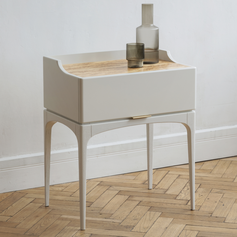Изящные опоры тумбы Tynd позволяют сохранить визуальное пространство спальни. Ящик с тканевым покрытием дна и плавными доводчиками практически бесшумно выдвигается, что сохраняет тишину и атмосферу спокойствия в доме. Особенно когда собираешься ранним утром, стараясь не потревожить близких. Обновленные тумбы оснащены лаконичной фурнитурой, что упростит процесс выбора отделки для других предметов интерьера, а возможность комбинирования отделки изножья и столешницы позволит по-разному взаимодействовать с пространством. Так же у расширенной коллекции появились бортики унаследованные от письменного и туалетного столов Tynd, которые уберегут от падения мелкие предметы.