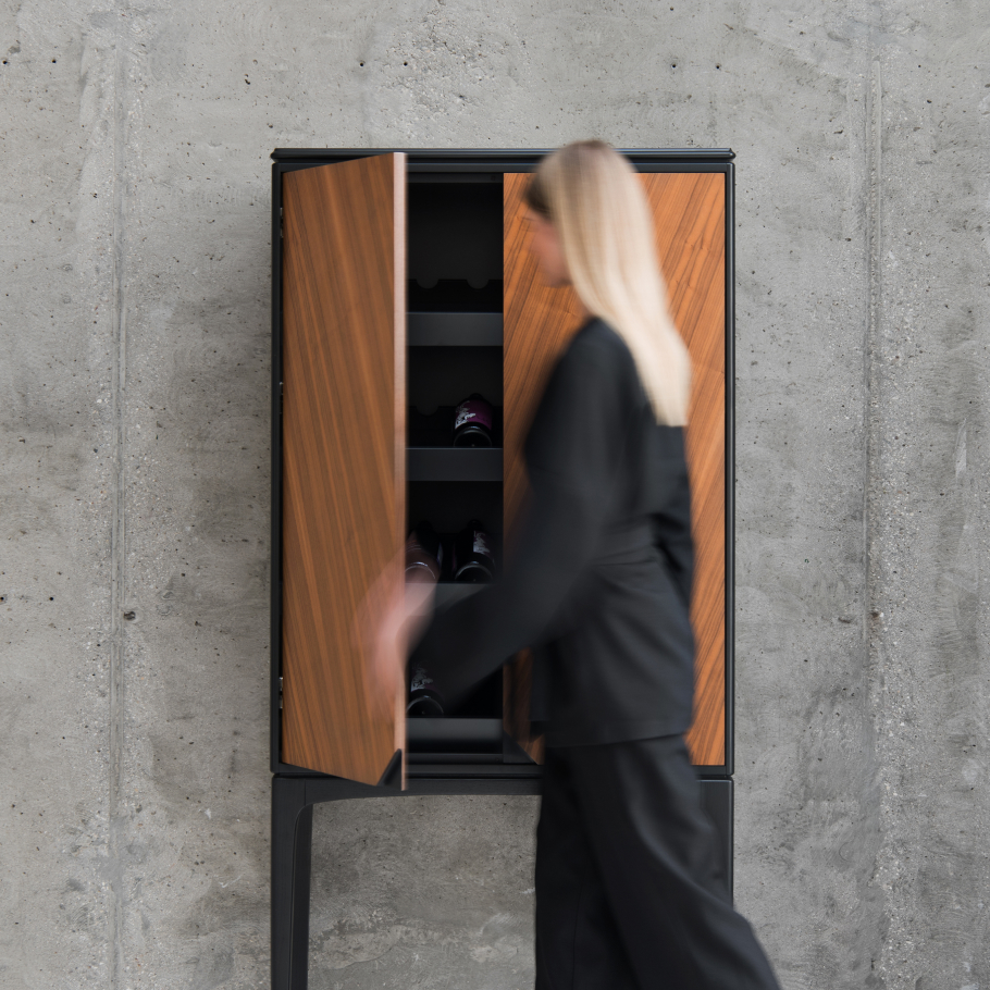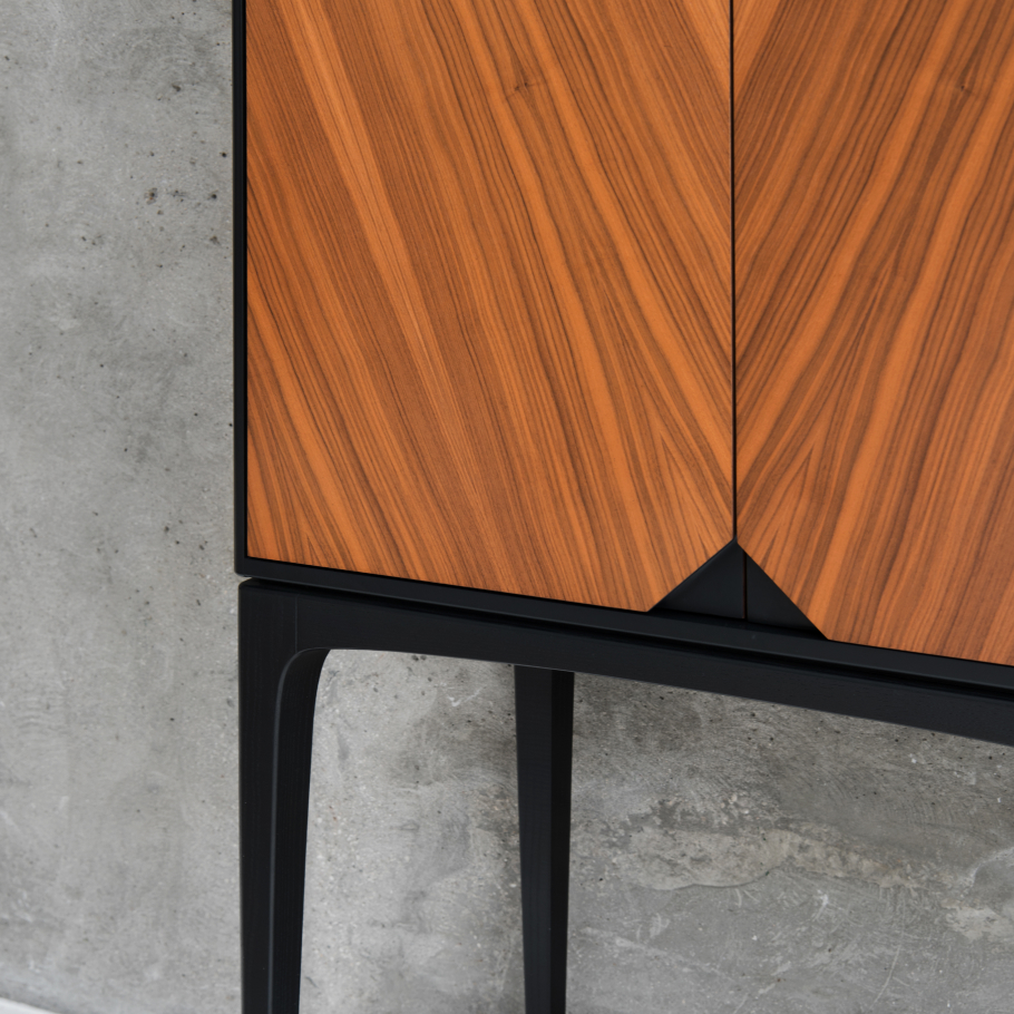 Фрезерованная ручка через ассоциации с галстуком-бабочкой собирает весь образ и добавляет ему деловитости и лоска. V-образная раскладка шпона задает легкую динамику и визуально облегчает габариты вместительного шкафа на изящных высоких опорах.