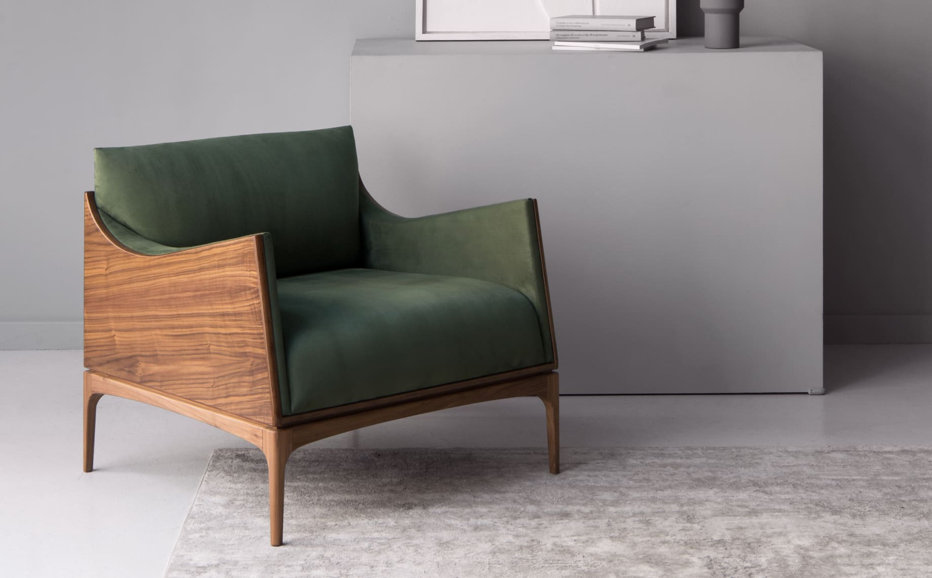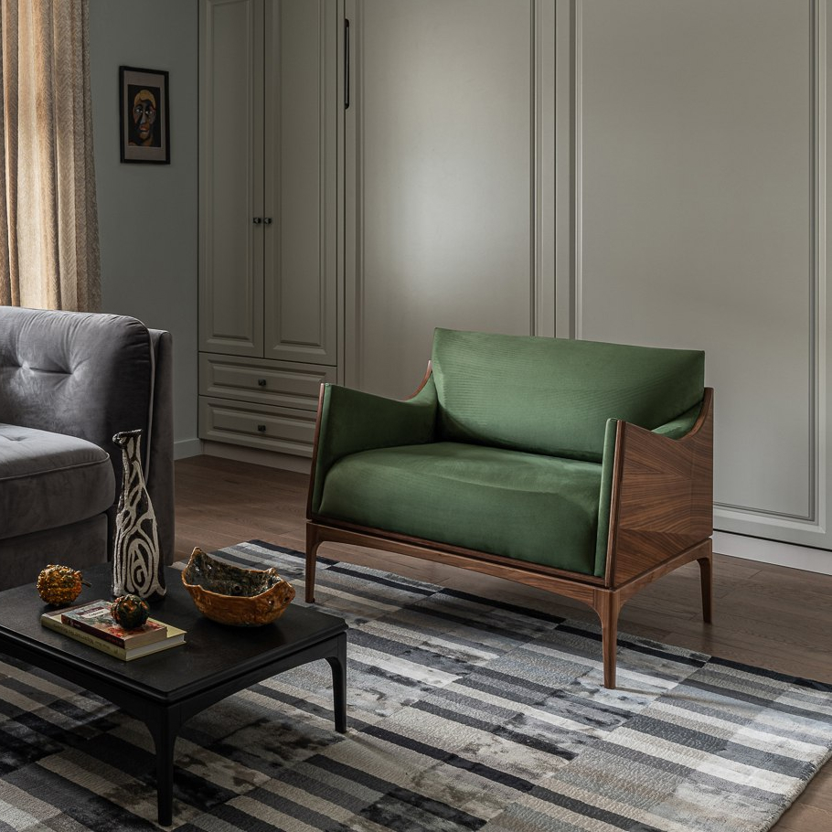 Модель имеет три отделки корпуса: дуб в графитовой эмали, натуральный дуб и американский орех, также кресло может быть исполнено в вашем индивидуальном цвете. Широкий ассортимент тканей и отделки дает возможность создать свое идеальное сочетание для интерьеров разных стилей.