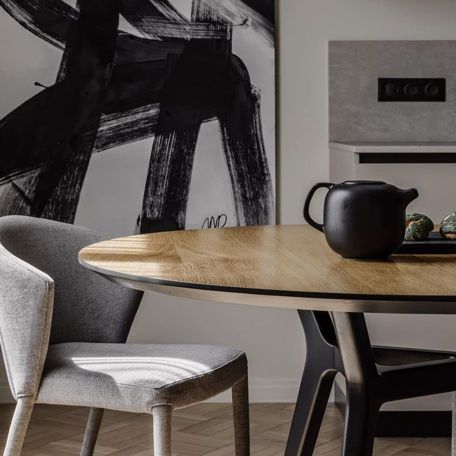 Треножный каркас стола Glat обеспечивает оптимальную степень прочности и устойчивости. Столешница выпускается в двух основных отделках: американского ореха и европейского дуба. Круглая форма стола удобна для сервировки и расположения гостей.