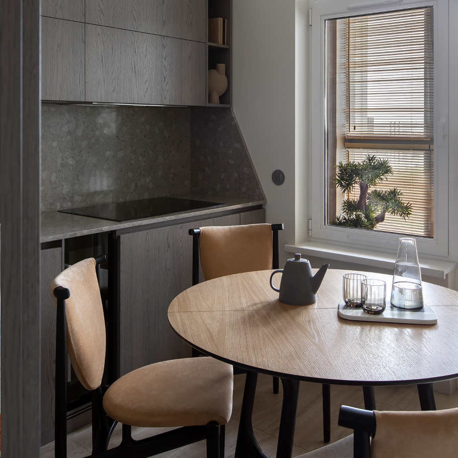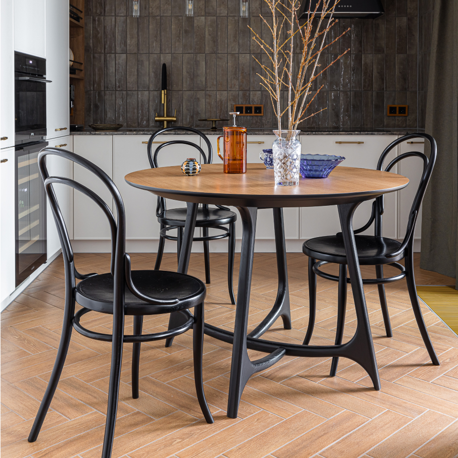 Одновременно легкий и устойчивый раскладной обеденный стол Kyns. В сложенном состоянии модель довольно компактна, а скрытый раскладной механизм позволяет с легкостью в одиночку осуществить трансформацию с увеличением диаметра стола на 38 см. Синхронный механизм раздвижения позволяет легко подготовить стол к приходу гостей.