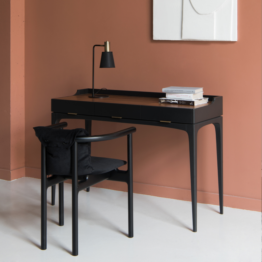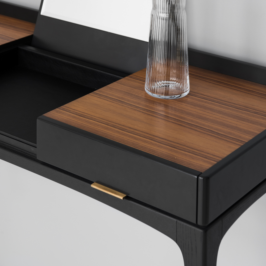 Туалетный столик Tynd по достоинству оценят те, кому важна многофункциональность предметов мебели. Под откидную среднюю секцию с зеркалом можно спрятать декоративную косметику, парфюмерию и любые другие вещи, которые нужны под рукой. Важная особенность этого отделения – это полностью скрытая фурнитура, что сохраняет визуальную чистоту образа. А матовая эко-кожа, использованная во внутренней отделке, позволяет легко следить за чистотой и не переживать по поводу рассыпанной пудры во время утреннего туалета. Ключевая особенность зеркала – широкий угол отражения, благодаря которому удобно создавать прическу даже девушкам высокого роста. Столешница покрыта натуральным шпоном для приятных тактильных ощущений. Надежный каркас подстолья из массива ясеня обеспечивает устойчивость конструкции.